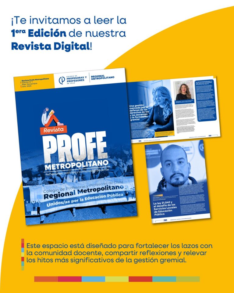 El Regional Metropolitano del Colegio de Profesoras y Profesores anunció la publicación de la primera edición de su revista “Profe Metropolitano”, un nuevo espacio editorial dedicado al análisis, la opinión y la reflexión en torno al quehacer gremial y educativo.